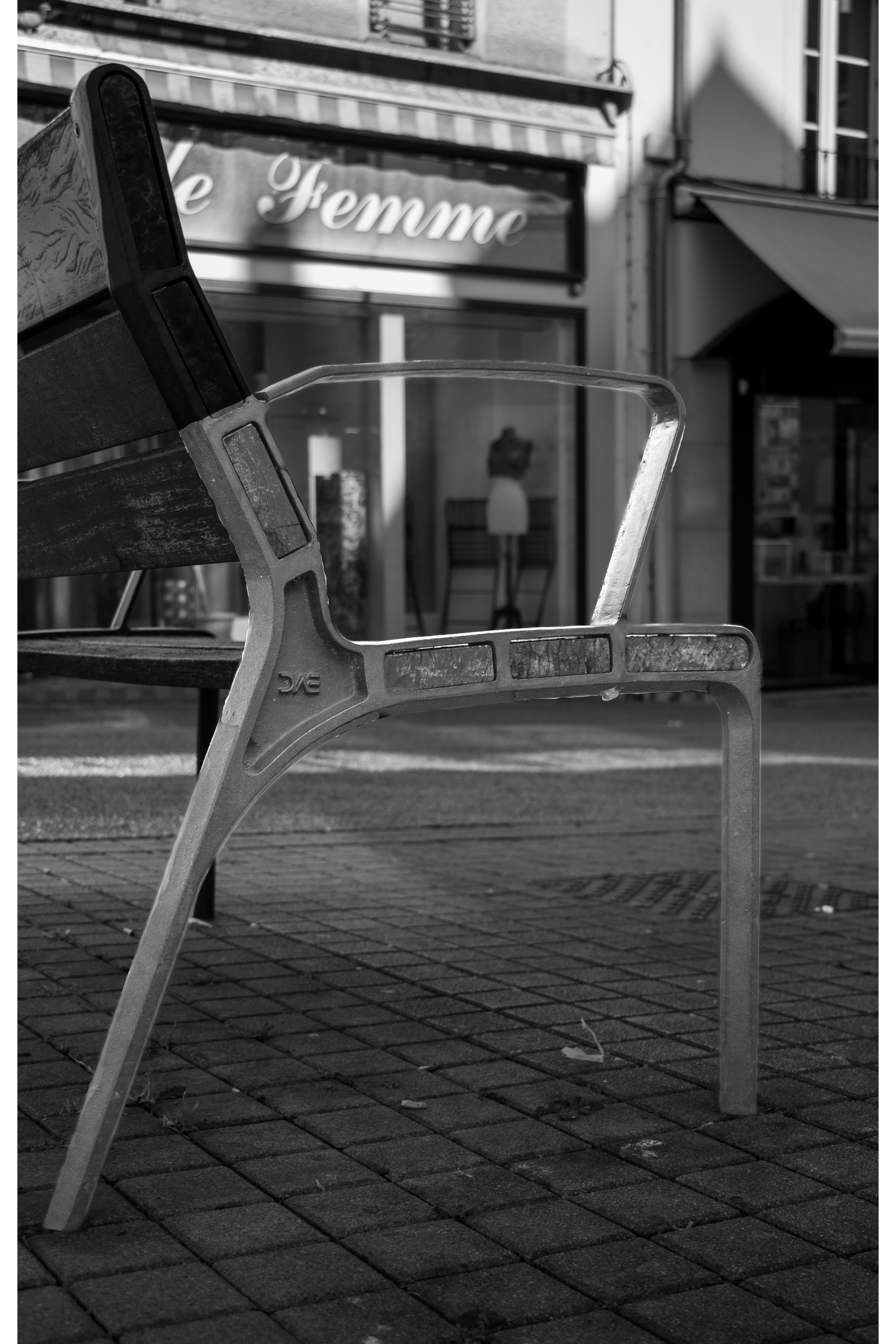 Lettre R suggérée par la structure métallique d’un banc public, situé en haut de la rue Nationale au Mans.